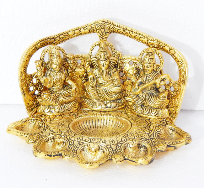 Diese wunderschöne Ganesh, Laxmi und Sarasvati-Statue aus Weißmetall mit Goldpolitur misst 8,5 Zoll. Sie vereint die Götter des Wohlstands, der Weisheit und der Hindernisüberwindung. Ganesh, Laxmi und Sarasvati bringen positive Energie, spirituelle Erleuchtung und Harmonie in Ihr Zuhause oder Büro.